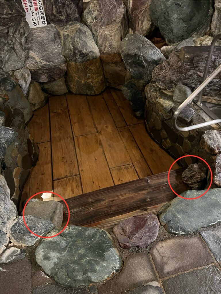 沸かし湯の手前(入るところ)には木の踏み板があり、その両端に石が置かれています。