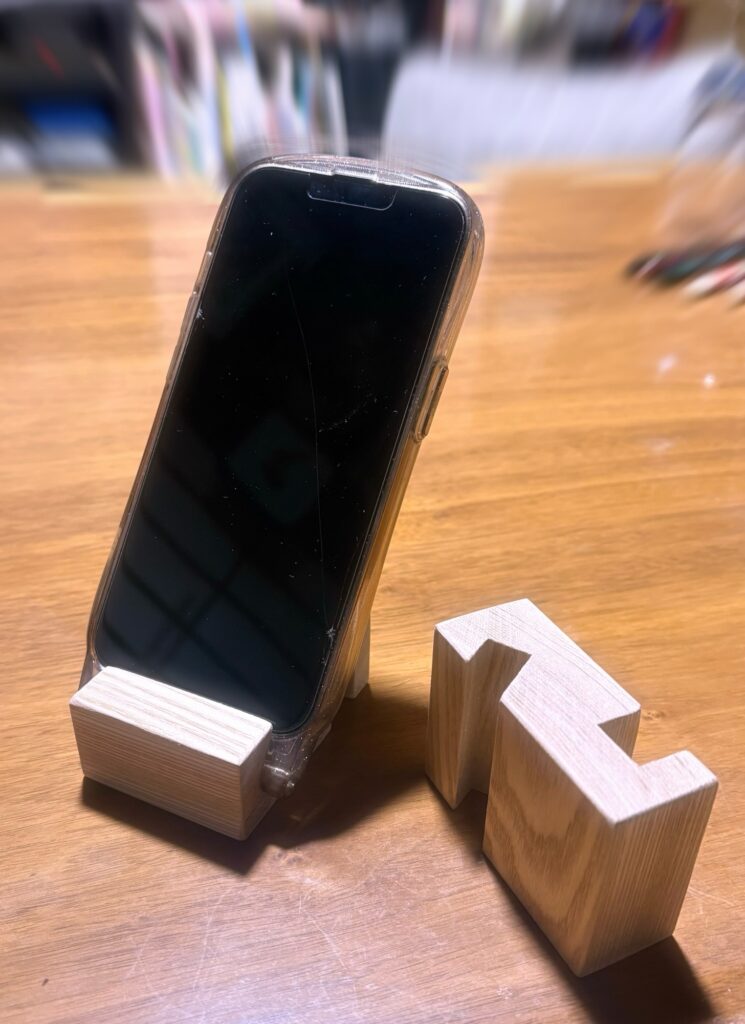 手作りの、木のスマホスタンド。