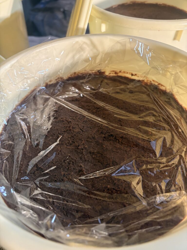 サランラップを上に敷き詰めて、蓋をして、熟成の準備完了です。